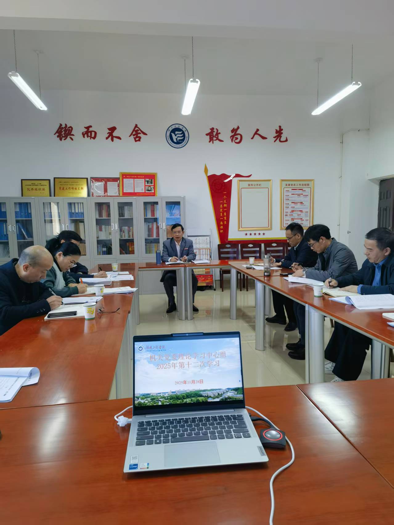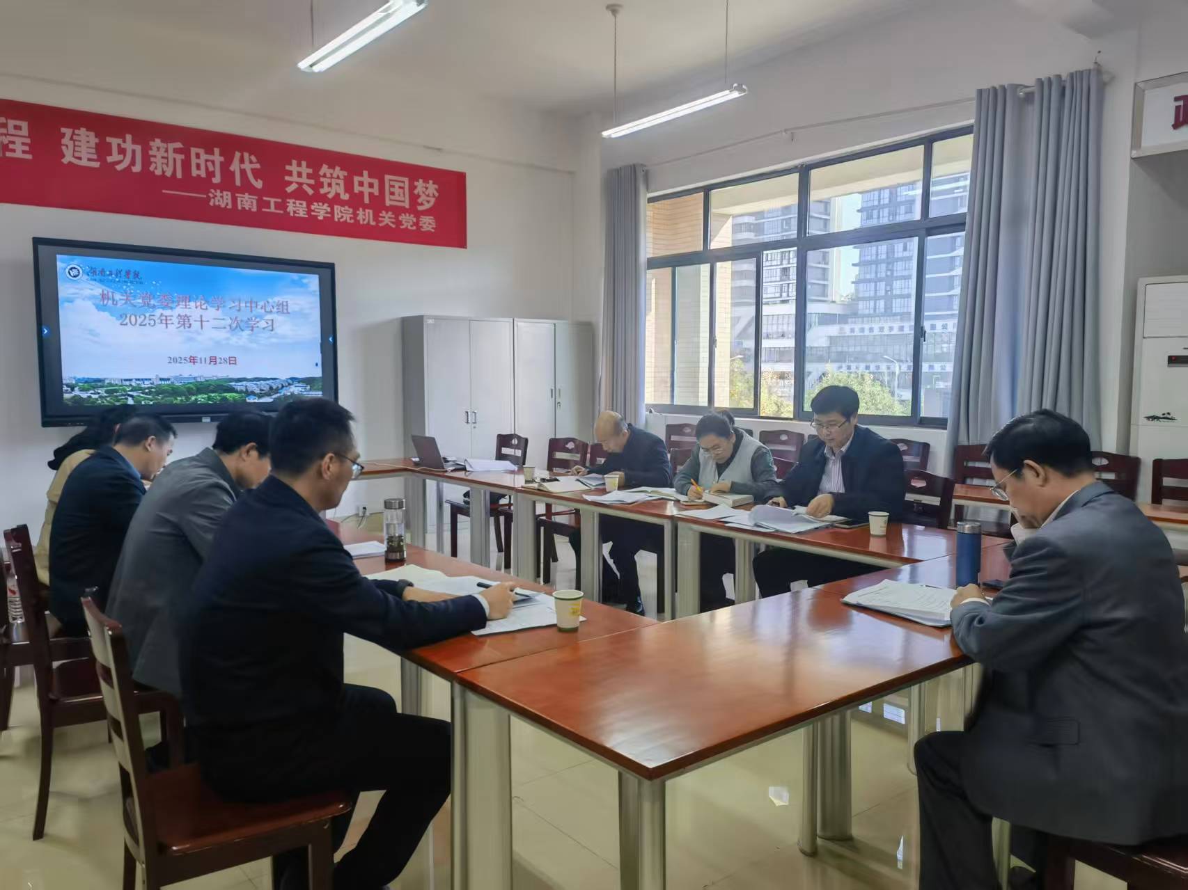 2025年11月28日下午,机关党委理论学习中心组在电气楼309B举行2025年第十二次集体学习。学习由机关党委书记阳海主持,中心组全体成员参加。校党委书记黄昕到场巡听并作指导点评,党委宣传部派代表旁听。